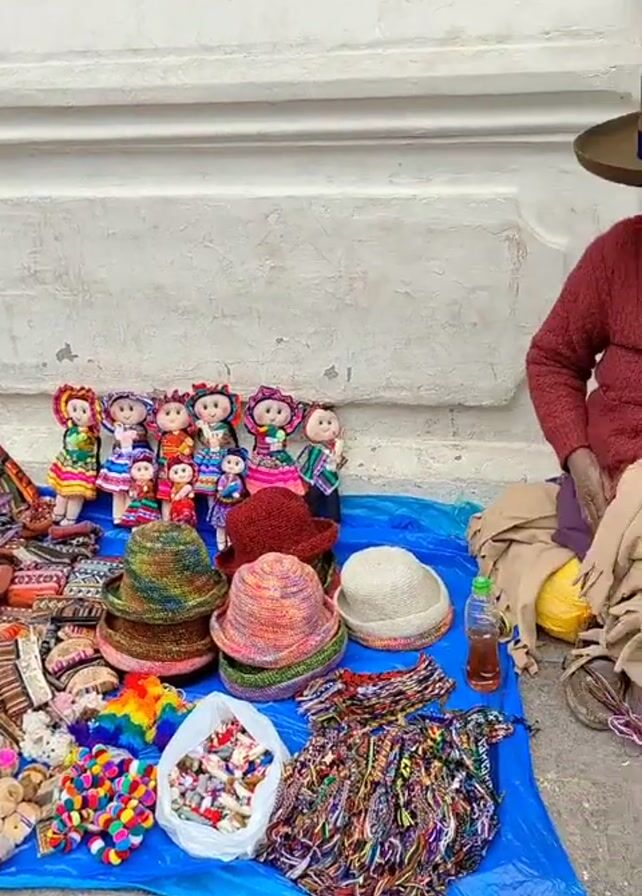 An elderly woman sits on the ground next to a collection of handmade wares. The woman is wearing a brown hat with a blue bow, a red sweater, a blue top, and a light brown skirt. She is seated cross-legged on a light brown blanket, which is on top of a small wooden stool. To her left, a blue tarp is spread out with various handmade items on display. These include several colorful dolls, a selection of knitted hats, many colorful woven bracelets and straps, and a small bag of candy. Behind the woman and the goods is a white wall with visible signs of wear and tear.