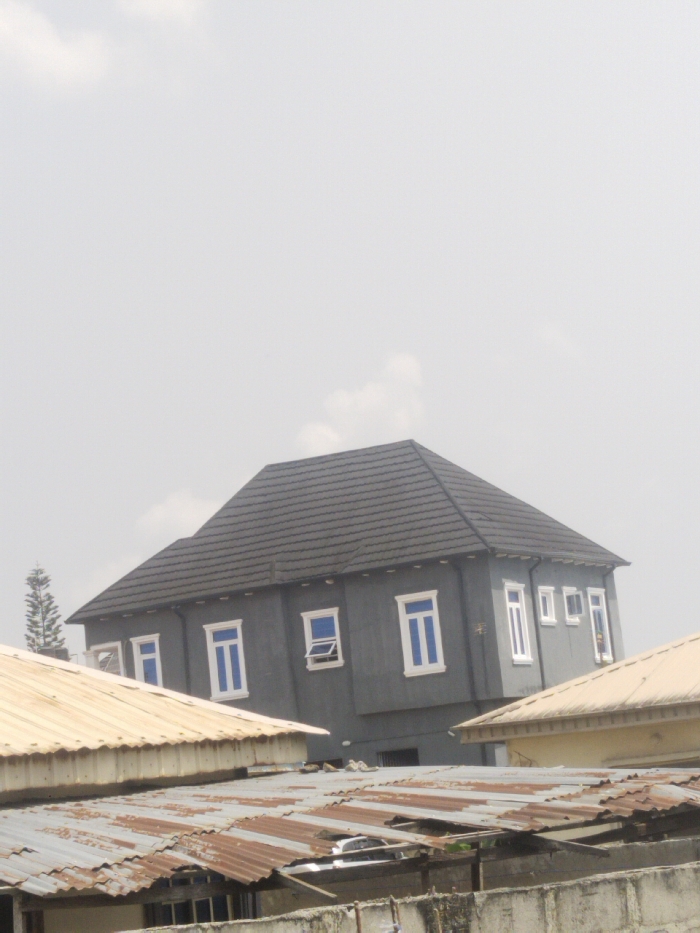 This image depicts an urban setting in Lekki, Nigeria, under a light grey, overcast sky. The primary subject is a two-story building with dark grey exterior walls and a dark grey hip roof. The building features multiple white-framed windows; several on the front facade are larger with blue-tinted glass, one of which is an awning window positioned open at the bottom. A cluster of smaller, square, white-framed windows with clear glass is visible on the building's right side. In the foreground, a series of rooftops is present. A clean, light beige corrugated metal roof is visible on the left. Below it, a severely rusted and degraded corrugated metal roof partially covers a structure, beneath which a portion of a white vehicle is discernible. Another section of a light beige corrugated metal roof is visible on the right. The lowest visible element is a weathered grey concrete block wall. A tall, slender conifer tree stands on the far left, partially obscured by the foreground roofs. No individuals, actions, or specific interactions are observable within the frame.