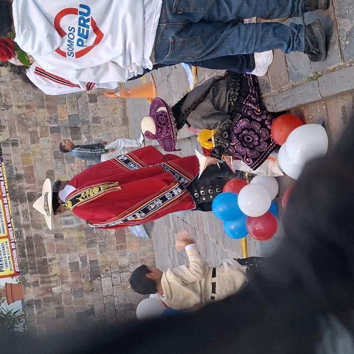An outdoor scene in Cuzco, Peru, depicts multiple individuals on a paved street or plaza against a background of a light brown stone wall
