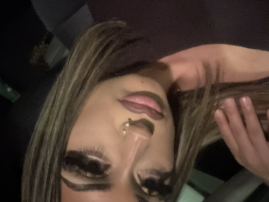 A close-up, slightly blurred portrait features a person with dramatic makeup. The individual has tan skin, dark eyeliner, heavy lashes, and dark lipstick. A nose piercing is visible. Light brown hair with blonde highlights frames the face, with fingers touching the right side of the hair. A dark, blurred background includes a suggestion of a car interior and a purple shirt is worn. The image is rotated to the side.
