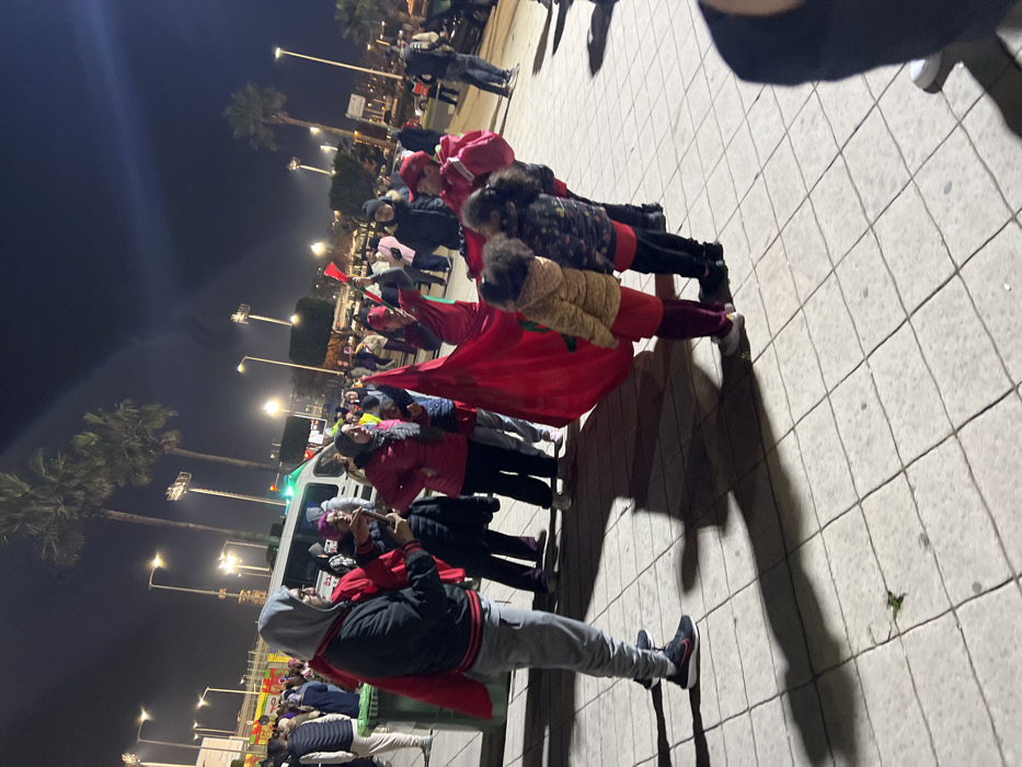 - "A crowd gathers at night under streetlights and palm trees, some holding Moroccan flags" by FM-PwtkB2, licensed under CC BY 4.0