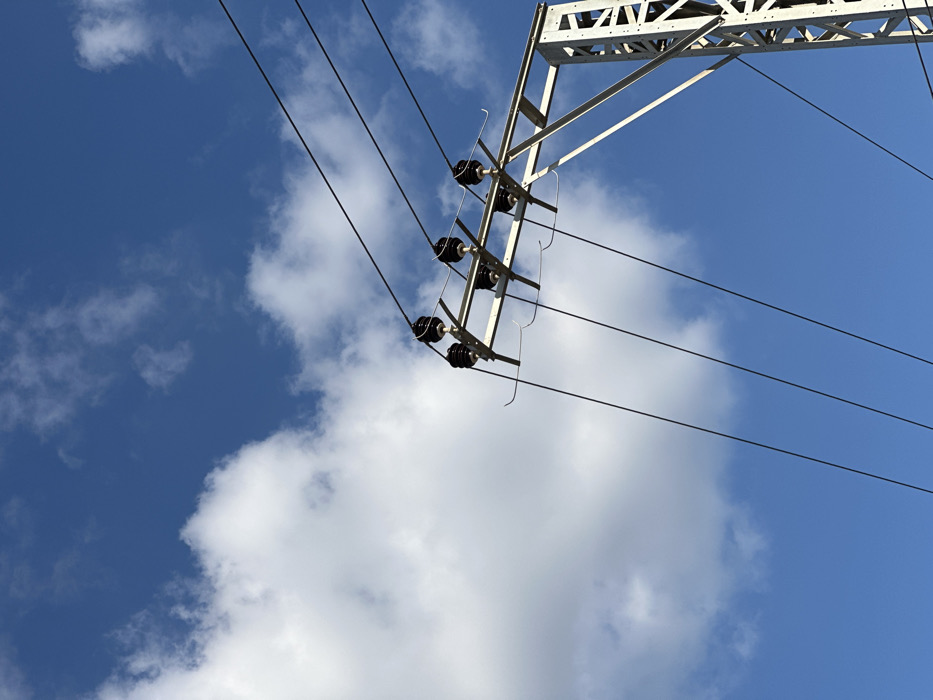 The image displays a clear blue sky with scattered white cumulus clouds, occupying the upper left and central portions of the frame. In the lower right quadrant and extending vertically upwards, a section of a metallic lattice-structure utility pylon is visible. Attached to the upper part of this pylon is a horizontal crossarm assembly, from which six dark, bell-shaped insulators are mounted. Five parallel electrical power lines are suspended by these insulators, traversing diagonally downwards and leftwards across the image. There are no individuals, animals, or discernible actions present within the scene. The location depicted is Beit Yitshak Sha'ar Hefer, Israel.