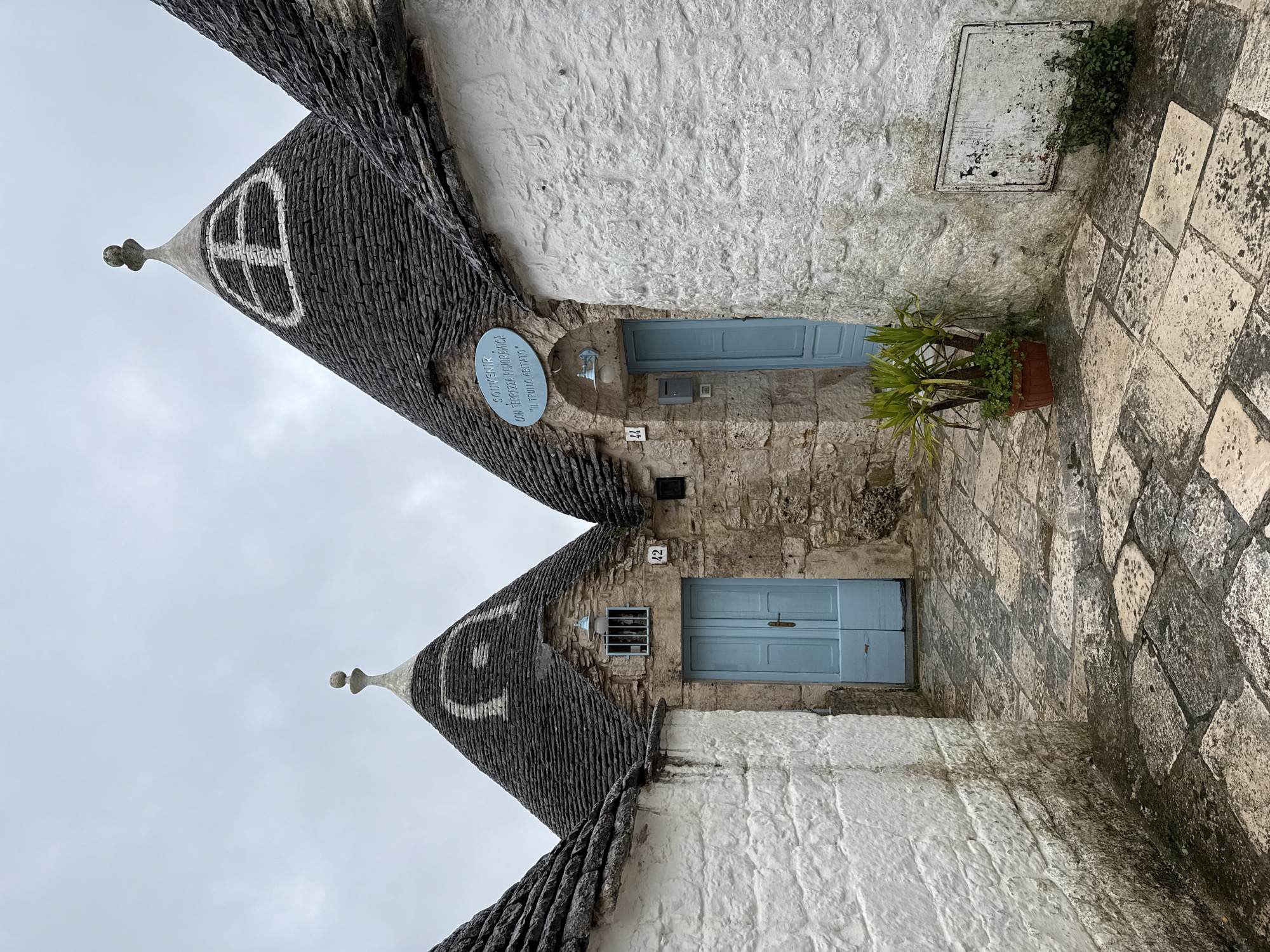 two adjoining Trulli structures in Alberobello, Italy. Each Trullo has a conical roof made of dark, layered stones. The roofs are adorned with white symbols. The top Trullo has a white cross symbol, while the bottom one has a cursive symbol. The walls of the structures are white. Each has a blue wooden door. The top Trullo has a sign above the door and a mailbox. A potted plant sits beside it. The lower Trullo has a small barred window. The ground is paved with rectangular stones. The sky is overcast.