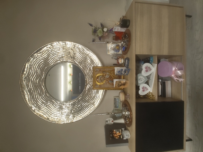 This image depicts an interior scene located in the city of Radinovo, Bulgaria. A light-colored wall serves as the background for a large, round mirror with a textured, wavy, silver-toned frame. The mirror reflects an overhead horizontal light fixture and a row of small, potted items or decorations in a brightly lit room. Below the mirror, a light wood-finished sideboard with dark, slender legs is situated. The sideboard features a black sliding door on its left side and two open shelves on its right. The top shelf of the open section holds two white heart-shaped decorative items and a cluster of golden-colored objects. The bottom shelf contains a stack of books or papers and a light purple cylindrical gift box secured with a pink ribbon. The top surface of the sideboard is adorned with a variety of objects arranged symmetrically around a central framed religious icon depicting the Virgin Mary and Child. To the left of the central icon, objects include a dark-framed photograph, a silver-colored ornate candle holder, a small white ceramic container, a silver tray holding multiple disc-shaped items, a glass bowl with a light-colored substance, and two greeting cards. To the right of the central icon, items include a small decorative figure, a smaller framed religious icon, another silver-colored ornate candle holder, a dark circular tray with various small objects, a clear reed diffuser bottle partially labeled "SVR", a small vase containing artificial white, green, and purple flowers, and a dark cylindrical bottle. The floor below the sideboard is a light-colored, even surface.