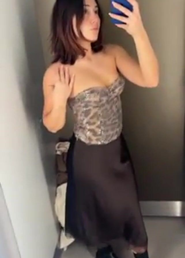 A young woman takes a selfie in a dressing room. She has medium-length brown hair and is wearing a strapless top with a shimmering leopard print, and a dark brown, silky skirt. She holds a blue cell phone up to the mirror, and her left hand is resting on her right shoulder. The room has tan walls and a wooden accent near the base of the frame. Other clothes are piled on the floor in the left corner. The woman is wearing black shoes.