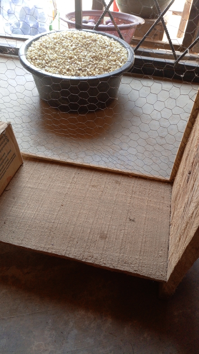 The image displays an indoor or semi-enclosed space in Unguwar Saya, Nigeria. A dark gray plastic basin, filled to capacity with numerous light-colored, granular kernels consistent with dried maize, is prominently positioned in the midground. A hexagonal wire mesh barrier stretches horizontally across the scene, placed in front of the basin and directly above a rough-hewn wooden surface that forms the lower half of the frame. A segment of a light brown cardboard box rests on the far left of this wooden surface. The underlying floor is dark concrete or dirt. In the background, beyond the basin and mesh, a red plastic basket containing dark, possibly reddish-brown, spherical objects is visible, alongside another indistinct dark container. These items are seen through what appear to be metal security bars, suggesting a window or secured opening, from which natural light illuminates the scene. No individuals are present.