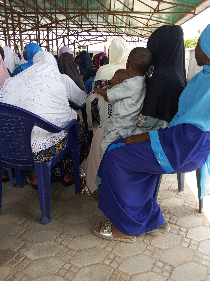 The image depicts a gathering of individuals, predominantly women and children, seated under an open-sided structure with a metal truss roof in Nagazi, Nigeria