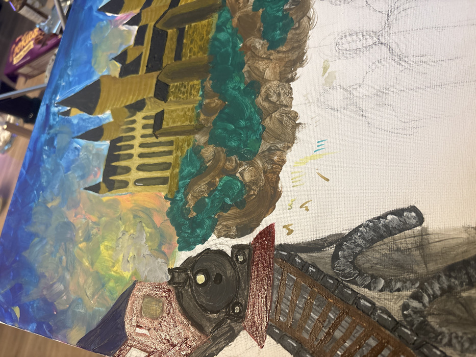 An angled overhead photograph displays a partially completed acrylic painting on a white canvas, physically situated in Plovdiv, Bulgaria. The painting depicts a fantastical landscape. On the upper right, a large, multi-towered golden-yellow castle with dark grey spires is rendered against a sky composed of vibrant blues, yellows, oranges, and whites. Below the castle, the midground features dense, textured brushstrokes in dark green and brown, representing foliage. In the left foreground, the front of a dark grey and black steam locomotive with red accents is visible, positioned on brown and grey railway tracks. Behind the locomotive, a building with a reddish-brown roof and a single window is partially painted. The lower right section of the canvas is unpainted, revealing light pencil sketches outlining multiple human figures, indicating planned additions to the scene. The visible brushstrokes confirm the acrylic medium. Blurred elements in the background suggest an indoor setting where the painting is located.