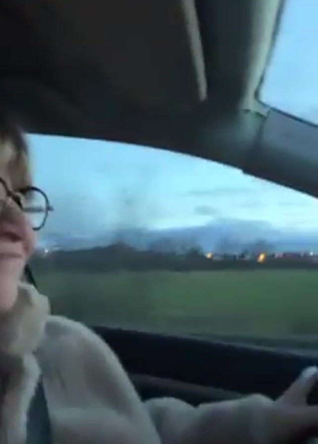 A woman with blonde hair and glasses drives a car. The sky outside is a pale blue, suggesting it may be dusk or dawn. The surroundings appear to be a rural area with a field visible through the car window. Music is playing in the background. The woman appears to be enjoying the drive, glancing towards the camera with a smile.