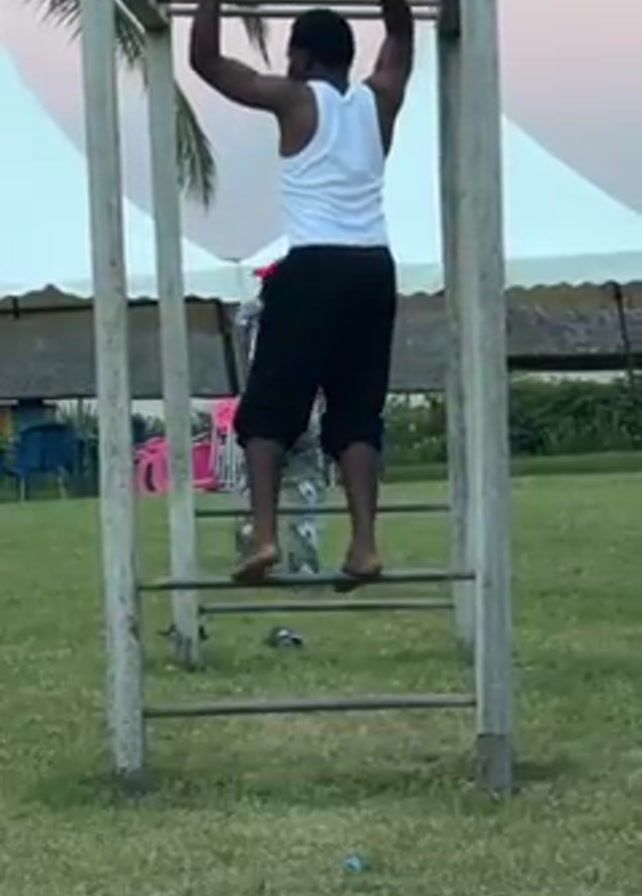 An African-descent man is performing pull-ups on a metal ladder-like structure outdoors on grass. He wears a white tank top and black pants. His feet are bare. Another person in a red cap and patterned pants stands behind him. A white tent structure is visible in the background, along with trees and chairs. The sky is dusky pink.