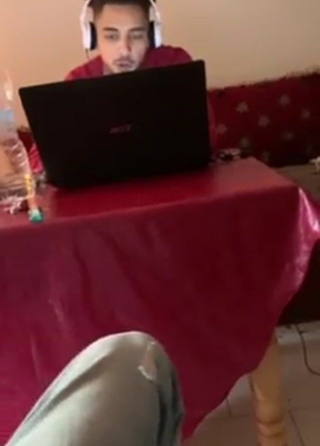 A young adult male with curly hair, wearing a maroon shirt and white headphones, is seated at a table. He is looking at a black Acer laptop that sits on the table. The table is covered with a red tablecloth. There is a water bottle and other items on the table to his left. The background includes a painting on the wall and part of a couch. The person is speaking while looking at the laptop screen. The video appears to be taken indoors. A portion of someone's jeans and shoes are visible in the lower-left corner of the frame.