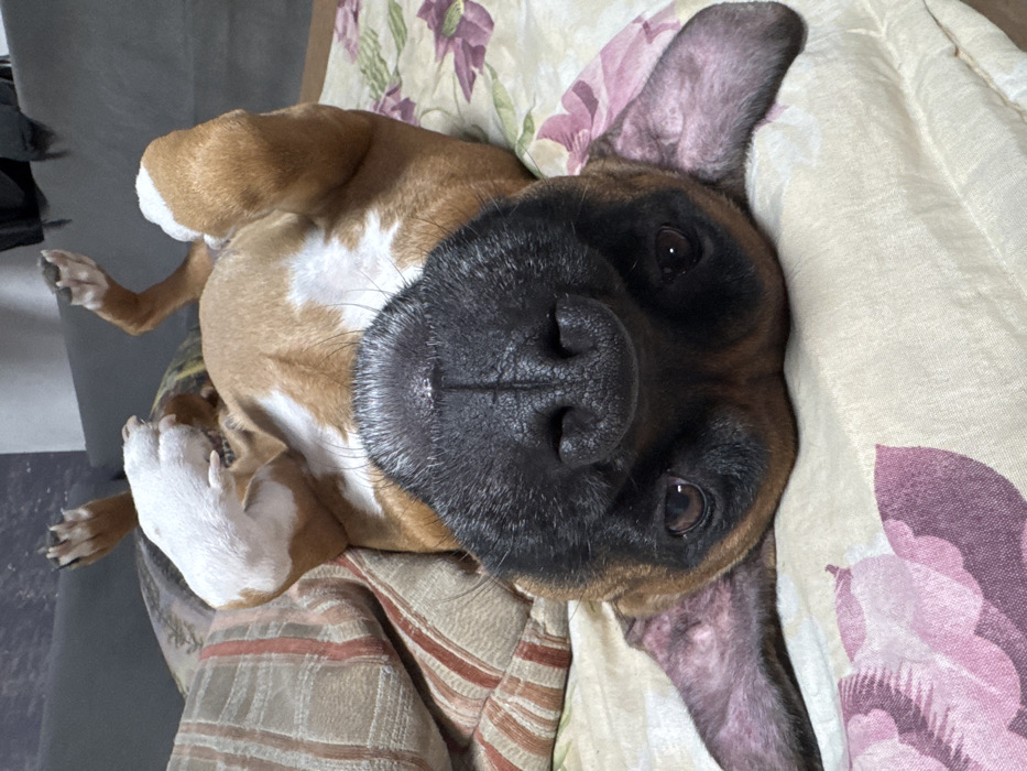 - "A medium-sized dog, appearing to be a Boxer or similar breed, is depicted lying on its back with its head inverted towards the viewer" by FM-L48Wm1, licensed under CC BY 4.0