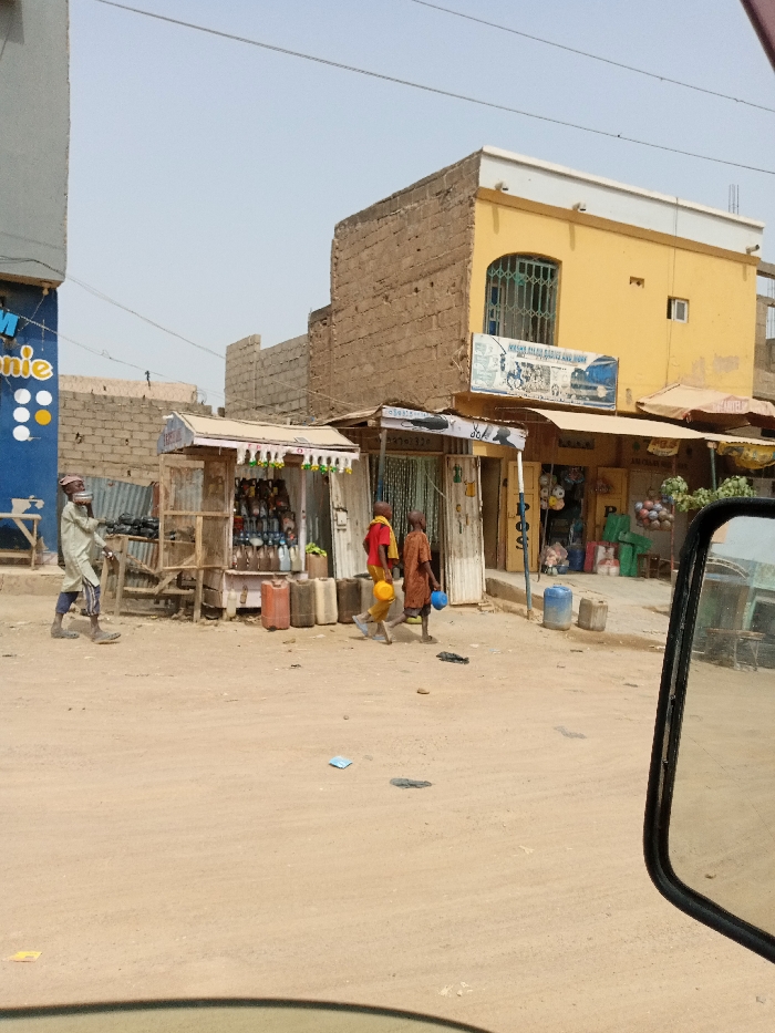 This daytime photograph depicts an unpaved urban street scene in Hotoro South, Nigeria, observed from the interior of a vehicle, evidenced by a partial side mirror on the right and a dashboard reflection in the lower foreground. The foreground features a dirt road with scattered minor debris. On the far left, a section of a blue building displays white and yellow circular decals, bordering an unpainted block wall structure. Adjacent to this, a makeshift vendor stall, constructed from wood and corrugated metal, displays numerous plastic bottles, with several orange and brown jerrycans positioned on the ground in front. To the right, a two-story yellow building with a white top trim presents a barred window on its upper floor. A large blue and white sign depicting vehicles and figures is mounted above its ground-level shops. Additional informal stalls with awnings line the base of the yellow building, exhibiting merchandise including what appear to be plastic balls. Two blue plastic barrels are situated on the ground near these stalls. Three individuals are visible on the dirt road, walking from left to right. The first, an adult male, wears a light-colored long garment over blue trousers, a facemask, and carries a dark object in his left hand. Following him are two younger individuals, each carrying a plastic bucket—one yellow, one blue. Overhead power lines are visible against a clear, light blue sky.