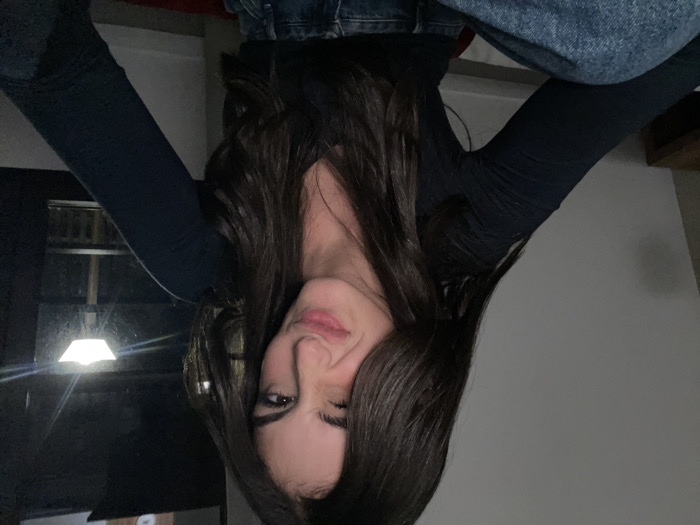 A young woman with long, dark hair poses playfully. Her face is tilted, with one eye squinted and her lips slightly pursed. She's wearing a dark, long-sleeved shirt and denim jeans or a jacket is visible at the top. A light fixture and a darkened area with vertical bars are in the background, suggesting an indoor setting. The image has been rotated.