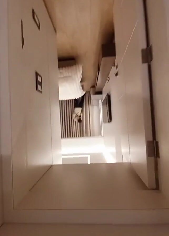 shot from a hallway, looking down towards a bedroom. The hallway has white walls and doors. The bedroom includes a bed with a white comforter, beige curtains, a television mounted on the wall, and a person wearing a beige top and dark pants. The person is standing in front of the curtains, seemingly looking down or adjusting something. The room has accent lighting under the furniture, and the floor is made of wood planks. The perspective is slightly tilted.