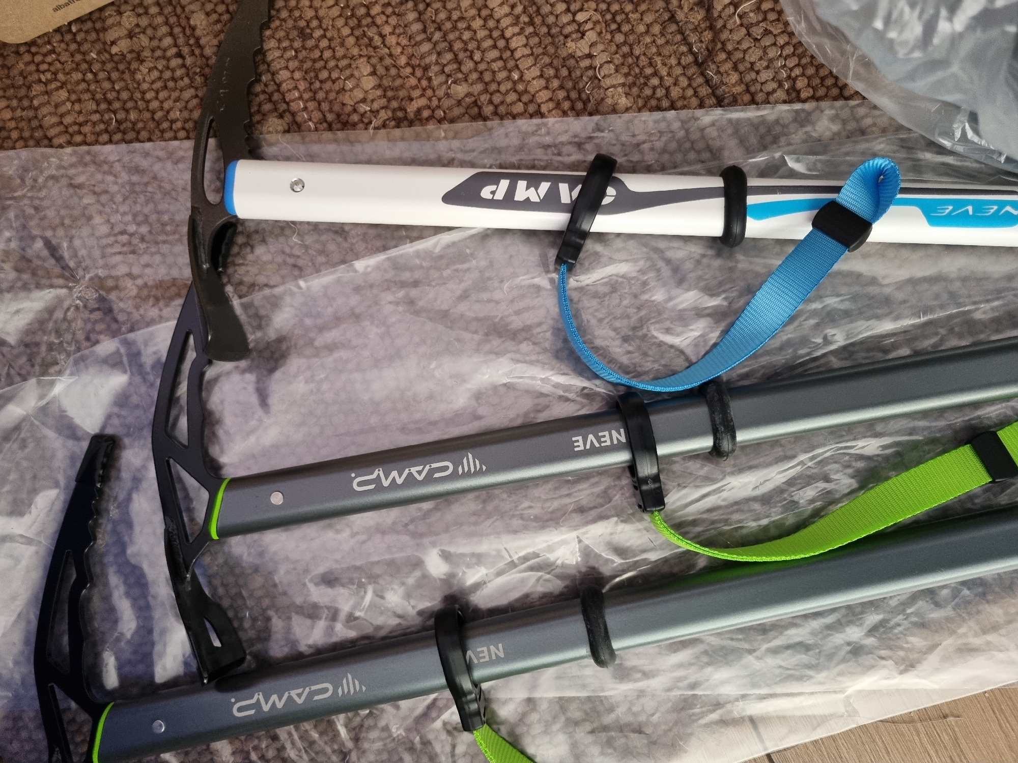 three ice axes, lying on a plastic sheet, which is set upon a brown, patterned surface. Two of the ice axes are grey with green wrist straps, and are labelled "CAMP NEVE". The third ice axe is white with a blue wrist strap and is labelled "CAMP NEVE". The setting appears to be indoors. The location in Galabovtsi, Bulgaria, is unknown.