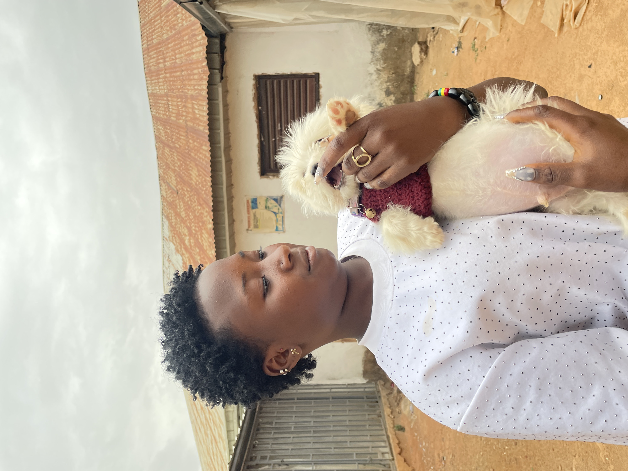 A young woman stands outside holding a small, white dog wearing a maroon sweater. The woman has dark curly hair and is wearing a white shirt with silver embellishments. She has multiple piercings in her left ear and wears a ring on her right hand. The dog appears to be nipping at the woman's fingers. The background includes a building with a corrugated metal roof and a window with metal bars. The ground is dirt. The location is Barakin Akawo, Nigeria.