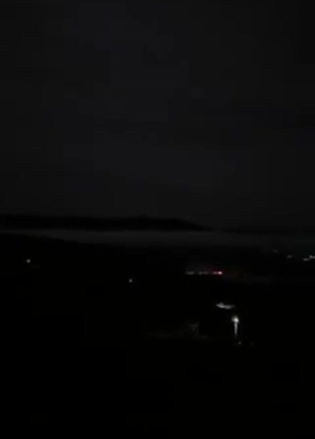 dark, nighttime scene with a distant cityscape visible in the horizon. There are faint lights from buildings or vehicles, and the sky is overcast with clouds. The foreground appears to be a dark, elevated area. A leafless tree is visible on the right edge of the frame.