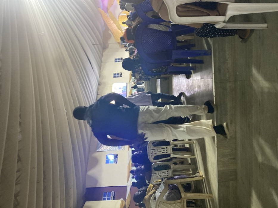 A slightly tilted indoor shot shows rows of seated people. Many are in blue or patterned shirts, seated on blue plastic chairs. A person in a dark shirt and white pants stands in the foreground. A large, white tent-like structure arches overhead. Several windows are visible on a wall. Some white plastic chairs are stacked in the foreground, and the floor appears to be light-colored concrete.