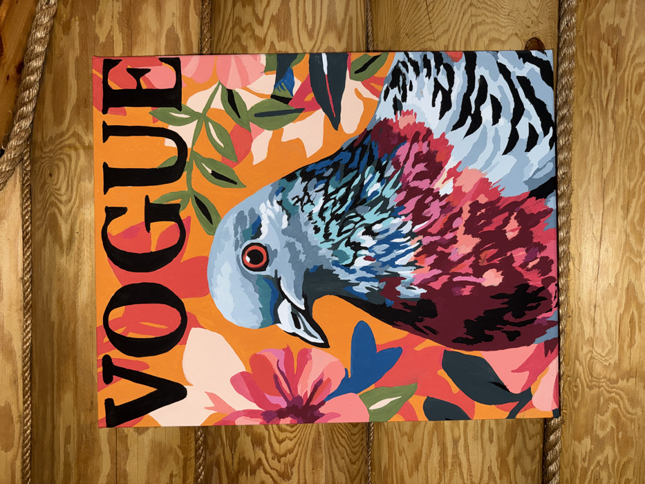 A vertically oriented, rectangular canvas painting is displayed leaning against a wooden log wall in an indoor setting in Toksovo, Russia. The artwork, executed in a stylized, bold manner with visible brushstrokes, depicts a vibrant, colorful pigeon against an orange background, framed by various stylized floral and leaf elements in shades of pink, red, blue, and green. The word "VOGUE" is prominently featured in large black capital letters across the top of the canvas. The pigeon is rendered in profile, facing left, with a light blue-gray head, white beak, and a red eye encircled by an orange ring. Its body is composed of intricate patterns in dark red, pink, light blue, and black, transitioning to light blue-gray with black striped feathers towards the lower body. The background consists of horizontally stacked, light brown wooden logs, exhibiting natural grain. A twisted, light-colored rope runs horizontally across the upper portion of the log wall, behind and above the painting. No individuals are present in the scene.