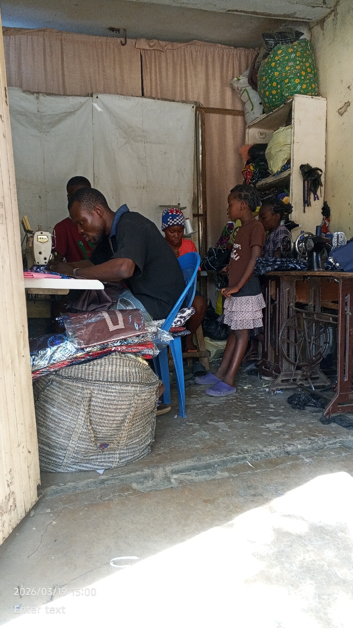This image depicts an active tailoring workshop located in the city of Gama, Nigeria