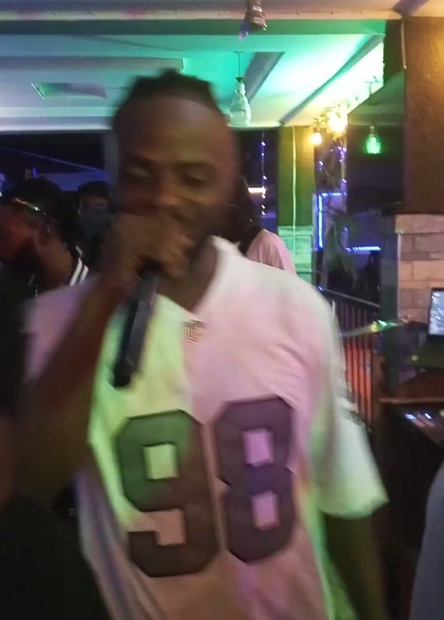Here's a breakdown of the video: The video is taken indoors, likely in a bar or club with a party atmosphere. The lighting is a mix of neon and dim lights. Several people are present, dancing and moving around. A man in a white jersey with the number "98" on it is holding a microphone and performing. Another man with dreadlocks and a varsity-style jacket is standing to the side, seemingly enjoying the music. Other people are visible in the background, though their features are not always clear. The camera then shifts to a DJ setup consisting of a DJ controller and a laptop. The DJ is actively using the equipment, mixing music. The environment suggests a party, with music playing and people moving around in a social setting.