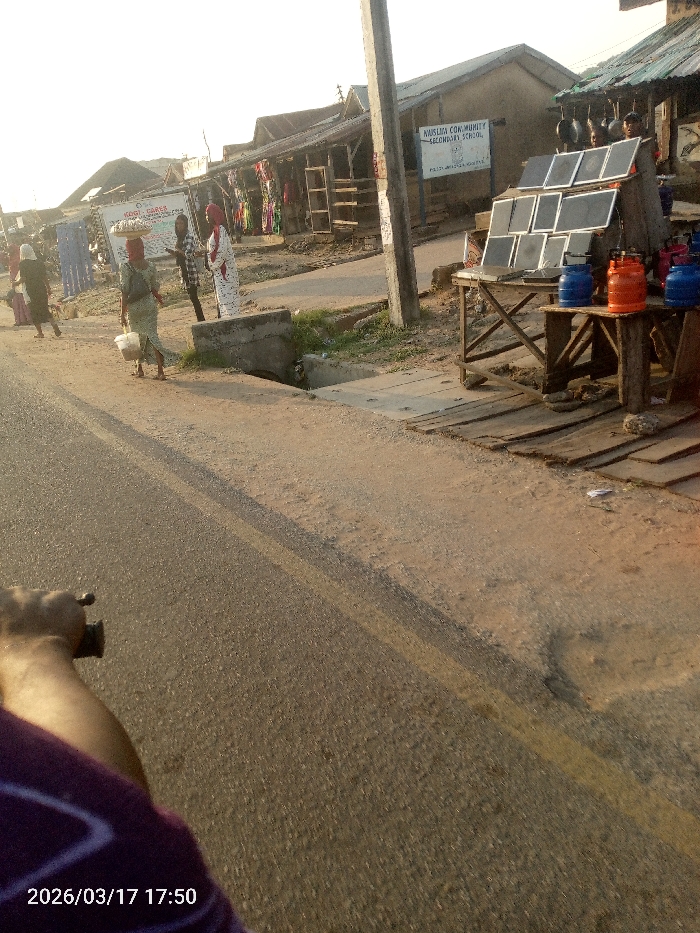 A street scene in Lokoja, Nigeria, is depicted from a low-angle, first-person perspective, likely from a moving vehicle. The timestamp "2026/03/17 17:50" is visible in the bottom left. In the immediate foreground, the right arm and hand of an individual, wearing a purple garment with white patterns, grasp a handlebar or grip. An asphalt road occupies the left, featuring a faded yellow center line. This transitions to a dirt and gravel shoulder on the right. Along the dirt shoulder, a concrete utility pole stands centrally. Adjacent to it, two wooden vendor stalls are present. The first stall displays approximately nine rectangular solar panels, arranged in two rows. The second stall, positioned further back and to the right, holds multiple gas cylinders, including two blue and one orange. A person is partially visible behind these stalls. Further down the dirt shoulder, a woman in a green dress walks towards the foreground, carrying a white plastic bucket in her left hand and a flat basket or tray on her head. Other pedestrians are visible behind her, including a woman in a white head covering interacting with a person in a plaid shirt, and another individual in dark clothing. A concrete drainage ditch or gutter runs along the edge of the dirt shoulder. In the background, a series of single-story structures with corrugated metal roofs, characteristic of market stalls or shops, line the street. A white sign with black lettering, reading "NUSLIM COMMUNITY SECONDARY SCHOOL LOKOJA" and "PUPILS ACADEMIC & MORAL EXCELLENCE," is prominently displayed on the right side. The sky is bright and hazy, consistent with late afternoon conditions, casting long shadows to the left.