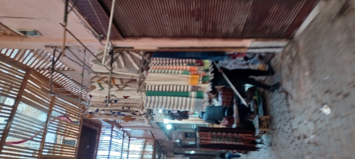 The image depicts a narrow, covered market alleyway, characteristic of a souk in the medina of Marrakesh, Morocco. Overhead, a slatted wooden roof structure provides partial shade, supported by metal bracing and affixed to light-pink painted building facades. The ground is paved with irregular cobblestones. Numerous textile items, predominantly scarves or throws, are displayed prominently. These hang from horizontal rods extending from the storefronts, exhibiting various patterns including stripes (blue/white, green/white), geometric designs, and solid colors. On the right side of the frame, a closed, corrugated metal roll-down shutter covers a storefront. In the mid-ground, a person wearing a dark jacket is seated on a low wooden stool, facing away from the camera, near a display of merchandise. Further down the alley, beyond this individual, artificial light fixtures illuminate interiors of other shops. In the foreground, a person is captured in motion, visible from the waist down, wearing dark pants and shoes. They are carrying a long, light-colored, thin object diagonally across their body, moving from left to right. A crumpled piece of white paper is visible on the cobblestone ground in the immediate foreground. The overall scene suggests a active, semi-enclosed commercial environment.