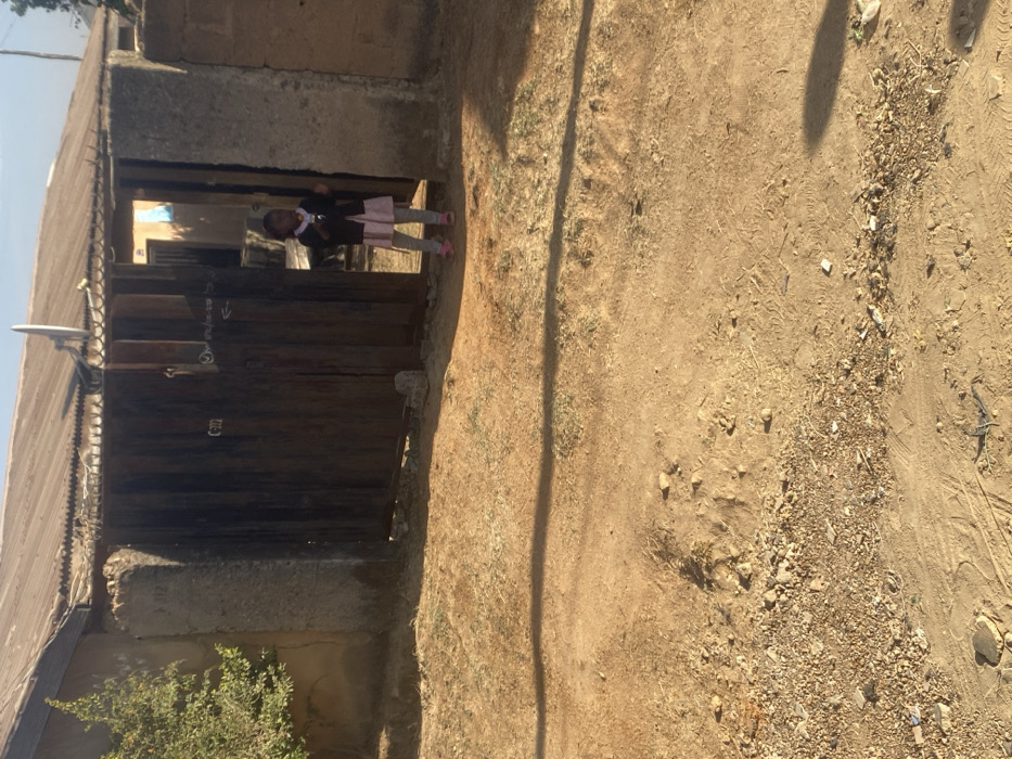 A young girl wearing a dark top and pink dress stands between a wooden gate and a stone frame. The gate is partially open, revealing a glimpse of the interior. The area in front of the gate is a dirt road with scattered rocks and debris. A thin shadow stretches across the road. Vegetation is seen at the bottom-left corner. A satellite dish is attached to the gate structure.