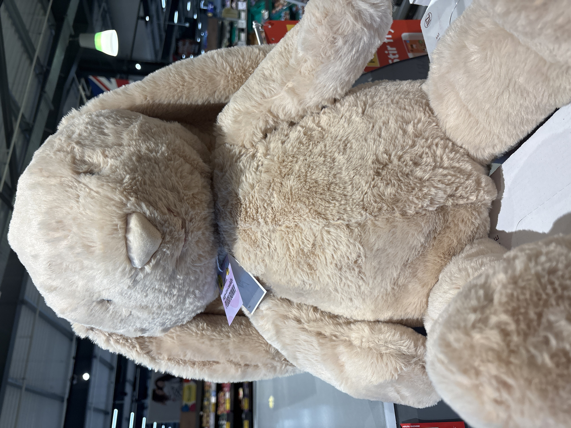 A large, beige plush bunny toy rests on a surface. The bunny has long ears and a small, triangular nose. A tag hangs from its neck. The background features a blurred view of store shelves and lighting fixtures, suggesting an indoor retail environment. While the location is noted to be Oswestry, United Kingdom, specific details within the image do not definitively confirm this location. No people are visible in the frame.
