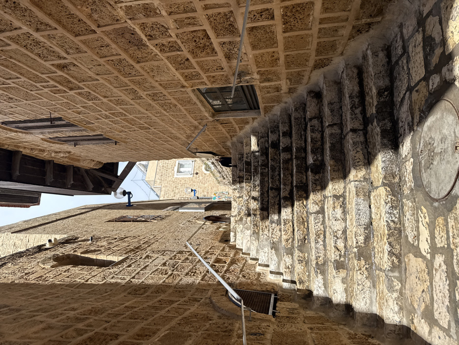 This image portrays a narrow, ascending stone alleyway and staircase in Old Jaffa (Yafo), Tel-Aviv, Israel
