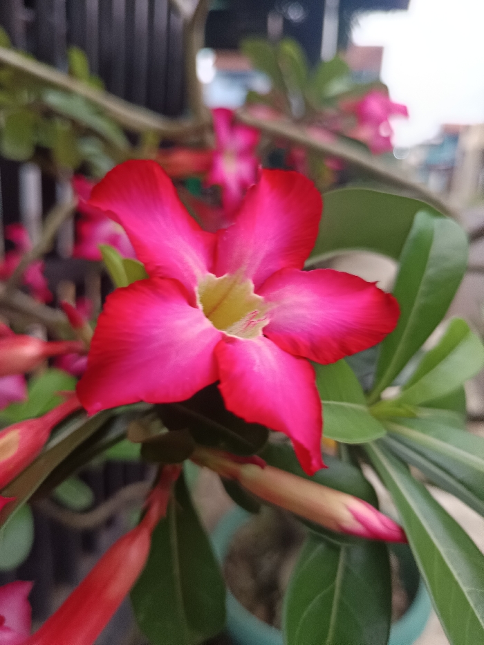 The image captures a close-up of a single, prominent five-petal flower, identified as an Adenium, situated in Maleber, Indonesia. The flower displays a deep pink to red hue along the edges of its petals, fading into a lighter pink towards its central yellow core. Surrounding the main bloom are multiple green leaves and several elongated, red-colored flower buds. A segment of a blue-green planter pot is visible at the bottom right. The background is significantly blurred, showing indistinct shapes of further foliage, dark vertical elements resembling a fence, and diffuse lighter areas suggesting an outdoor setting. No individuals or specific actions are depicted.