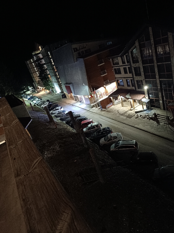 An elevated nocturnal image captures a street scene in Pamprovo, Bulgaria. A heavy wooden railing extends across the lower left foreground, suggesting the viewpoint is from a balcony or terrace. Below this, a dark, uneven slope with sparse vegetation descends to a paved road. Numerous passenger vehicles, predominantly sedans and SUVs of various colors (white, silver, black, red), are parked bumper-to-bumper along the left side of the road, facing right. Patches of snow or ice are visible on the road surface, especially on the right side and near the buildings. The background is dominated by several illuminated multi-story buildings. On the upper left, a prominent light-colored building with multiple windows displays "Hotel Орловец" (Hotel Orlovetz) signage near its roofline. Adjacent to it, a building constructed with alternating reddish-brown brick and metallic grey cladding features illuminated ground-floor establishments, including an "ОБМЕННО БЮРО" (Exchange Office) and a ski/snowboard rental shop. To the right, another multi-story building with a darker, possibly stone-clad facade presents a distinctive wooden-roofed entrance canopy. Artificial lighting from streetlights and building interiors casts bright areas and deep shadows across the scene. No individuals or specific actions are discernible within the frame.