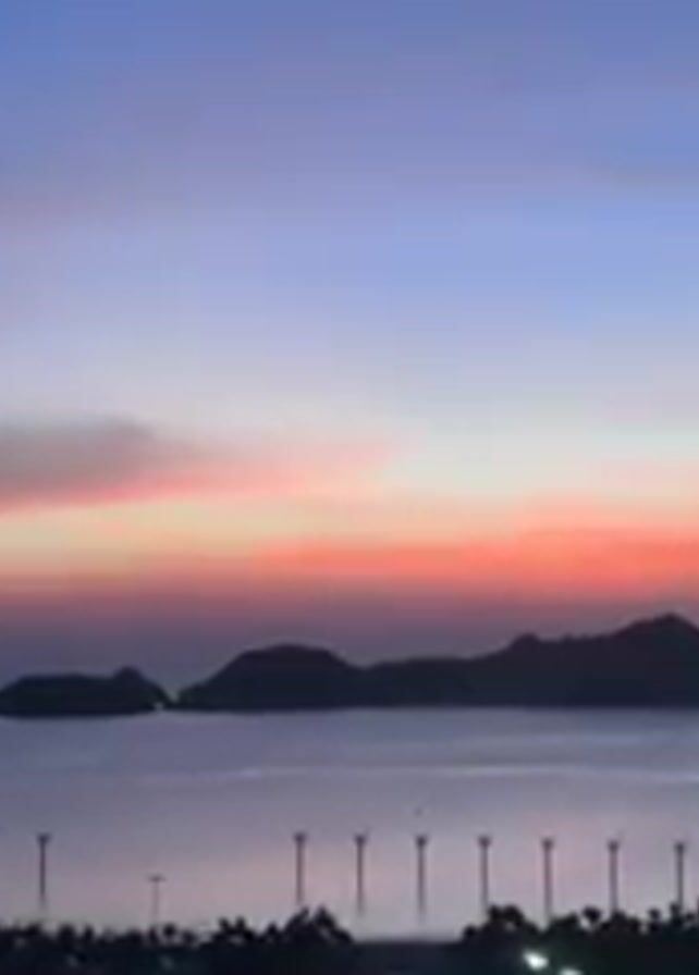 The video displays a scenic shot of a tranquil body of water dotted with islands silhouetted against a vibrant sunset. The sky exhibits a gradient of colors, with a blend of blue, pink, and orange hues. In the foreground, a series of wind turbines stand along the shoreline, with some vegetation and buildings visible at the very bottom of the frame. The overall atmosphere of the scene is serene.