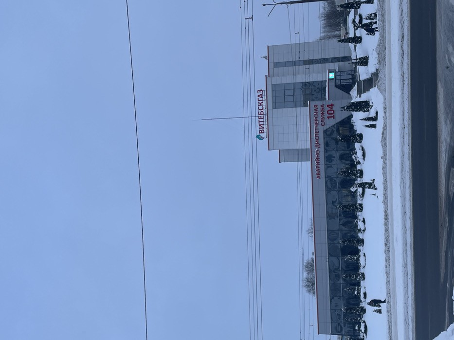 The image depicts a winter street scene in Vitsebsk, Belarus, centered on a modern building complex under a pale blue sky. The ground and all landscaping are covered in snow. The primary subject is a multi-structure building. The prominent structure is a two-story elongated building with a glass facade featuring reflective, rounded panels. Above these panels, a horizontal band displays the Cyrillic text "АВАРИЙНО-ДИСПЕТЧЕРСКАЯ СЛУЖБА 104", which translates to "EMERGENCY DISPATCH SERVICE 104". To the right, this building has an entrance reached by a set of concrete steps. Behind and to the right of this structure stands a taller, multi-story building with a light-colored facade and extensive glass sections. On its roof, a prominent red sign with a blue gas flame logo reads "ВИТЕБСКГАЗ" (VITEBSKGAZ). A slender, dark antenna or spire extends vertically from the roof of this taller building. In front of the lower building, a landscaped area is covered in snow, featuring numerous small, conical evergreen shrubs arranged in rows. On the far right, partially obscured, are dark, abstract sculptures resembling deer, also snow-covered. In the foreground, a dark asphalt road, partially clear of snow, runs horizontally across the frame. Snow is piled on the road shoulders and the median strip separating the road from the building complex. One individual, dressed in dark clothing, is visible walking on the snow-covered ground to the left of the lower building, moving towards the right. Overhead, multiple thin, dark utility lines span horizontally across the frame. A street light pole is visible on the far right side of the image. The sky is a uniform, light blue, suggesting a cold, possibly overcast day.