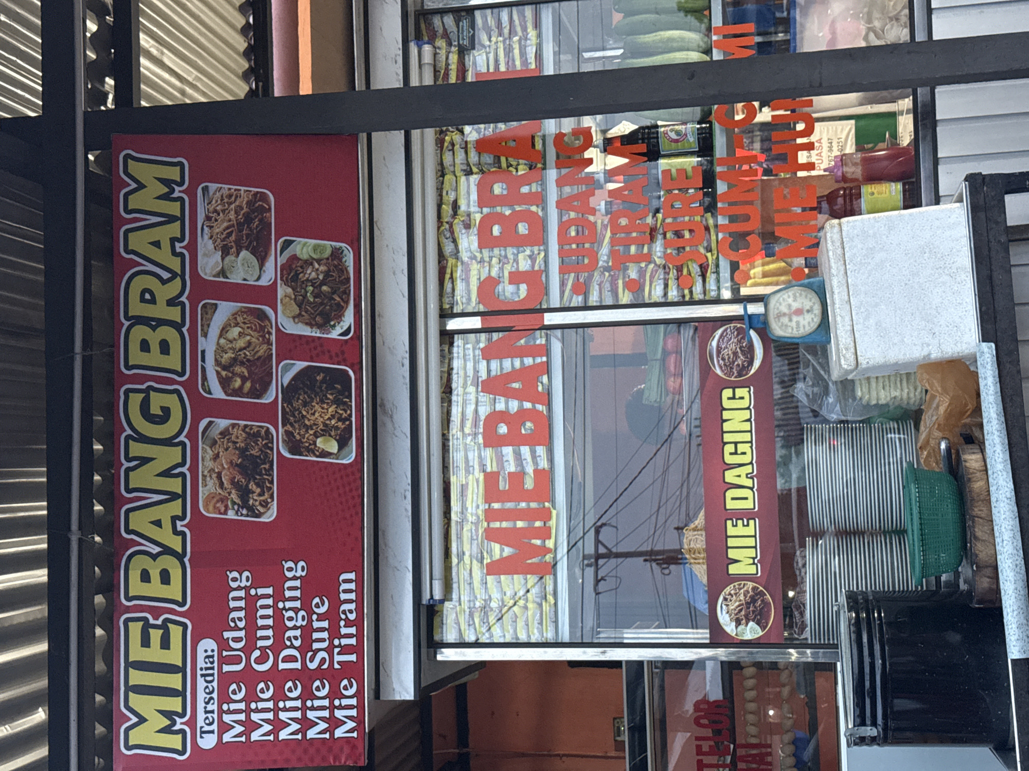 food stall with a sign that reads "MIE BANG BRAM," located on a street in Tingkeummanyang, Indonesia