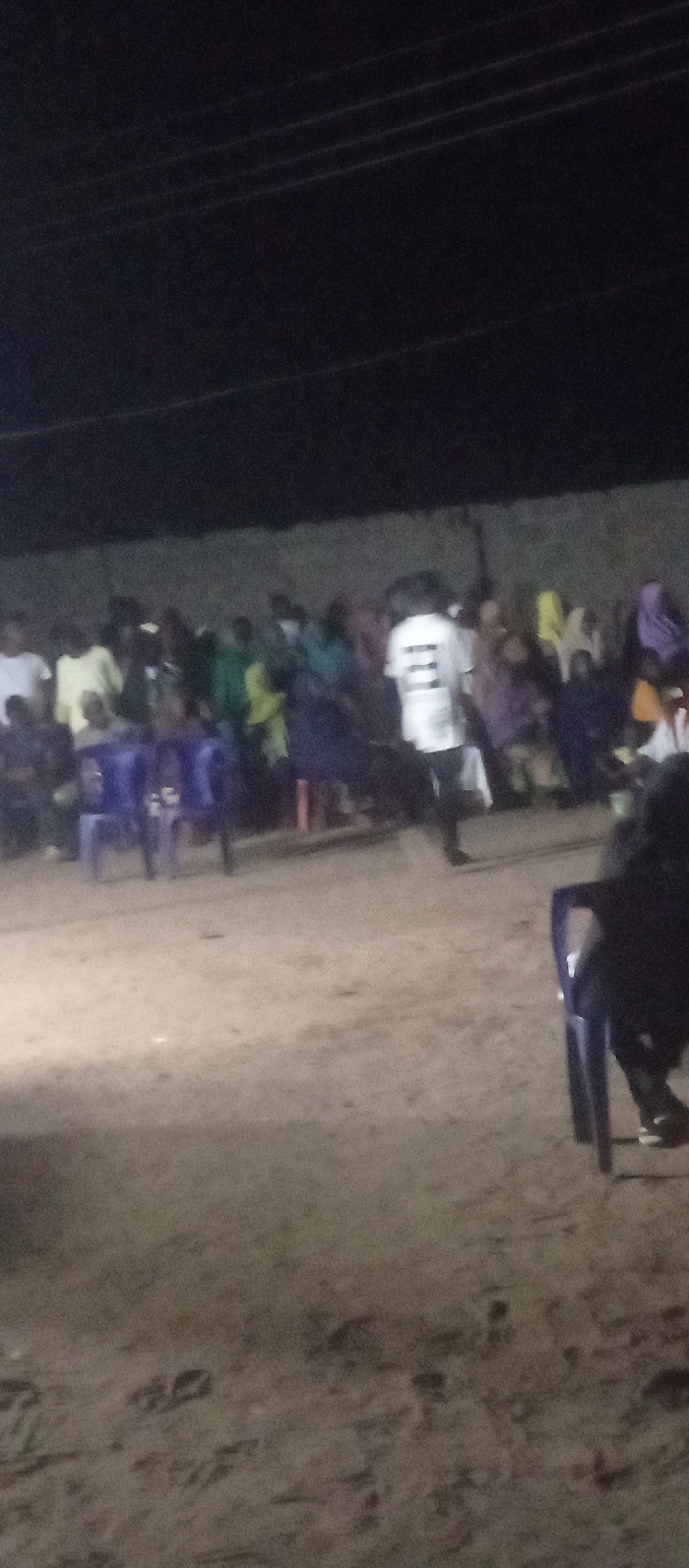 A nighttime gathering shows a crowd of people, some seated in blue chairs. Most faces are indistinguishable due to the low light. An individual in a white shirt stands out in the center. Above the crowd, power lines stretch across the dark sky. The ground appears to be dirt or sand. A few additional chairs are visible in the foreground.