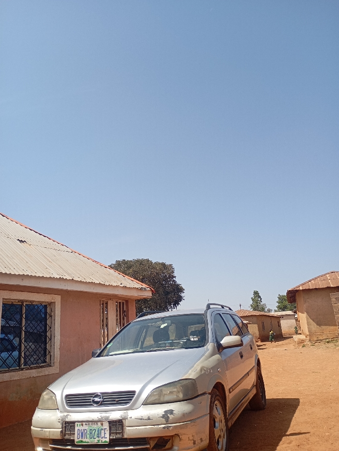 The scene depicts an outdoor environment in Bisichi, Nigeria, under a clear, bright blue sky. A silver Opel Astra G station wagon is prominently parked on a reddish-brown dirt path, angled slightly towards the left of the frame. The vehicle's front bumper shows significant paint loss and scuffing, and its headlights are yellowed. A roof rack is installed. The front license plate reads "ABUJA BWR-824CE". To the immediate left of the car is a single-story building with peach-colored walls and a silver corrugated metal roof, featuring a window with a dark security grille and reflective glass. A large, dense green tree is visible behind this building. Further into the background, along the dirt path on the right, are additional single-story structures with earthy-toned walls and simple roofs; one building on the far right has a distinctly rounded form. Two small, indistinct human figures are visible in the far distance on the dirt path, appearing to walk or stand.