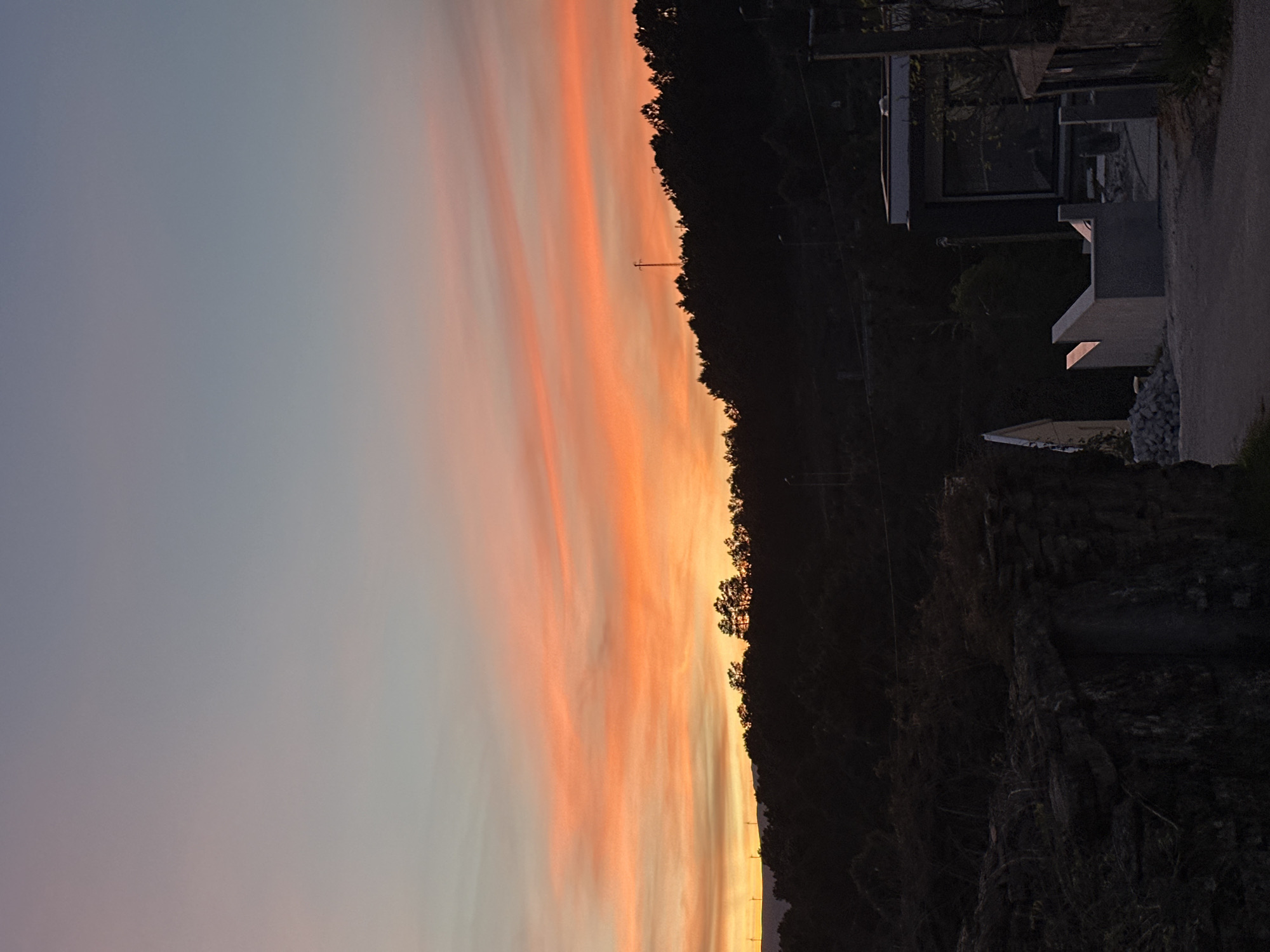 landscape in Vila Real, Portugal at sunset or sunrise. To the left is a gradient sky transitioning from light blue to orange, with distinct pinkish cloud bands. A dark treeline runs along the horizon, silhouetted against the colorful sky. A utility pole is visible among the trees. To the right, a paved road and modern architecture are present, including a building with large windows and a possible balcony. A stone wall and some vegetation are in the foreground. The scene appears to be taken at dusk or dawn, with low light levels overall.
