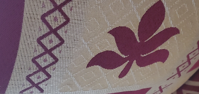 The image displays a close-up, angled view of a woven textile fabric, identified as being in the city of Kitonyoni, Kenya. The fabric is predominantly light beige/tan with patterns in dark reddish-purple. A solid band of dark reddish-purple runs horizontally across the top section. Below this band, a repeating geometric pattern of linked dark reddish-purple diamond shapes is visible. Further down and centrally, larger, stylized dark reddish-purple leaf or floral motifs are interwoven into the beige background. The fabric exhibits a visible woven texture. No individuals, actions, or specific environmental details beyond the fabric itself are discernible.