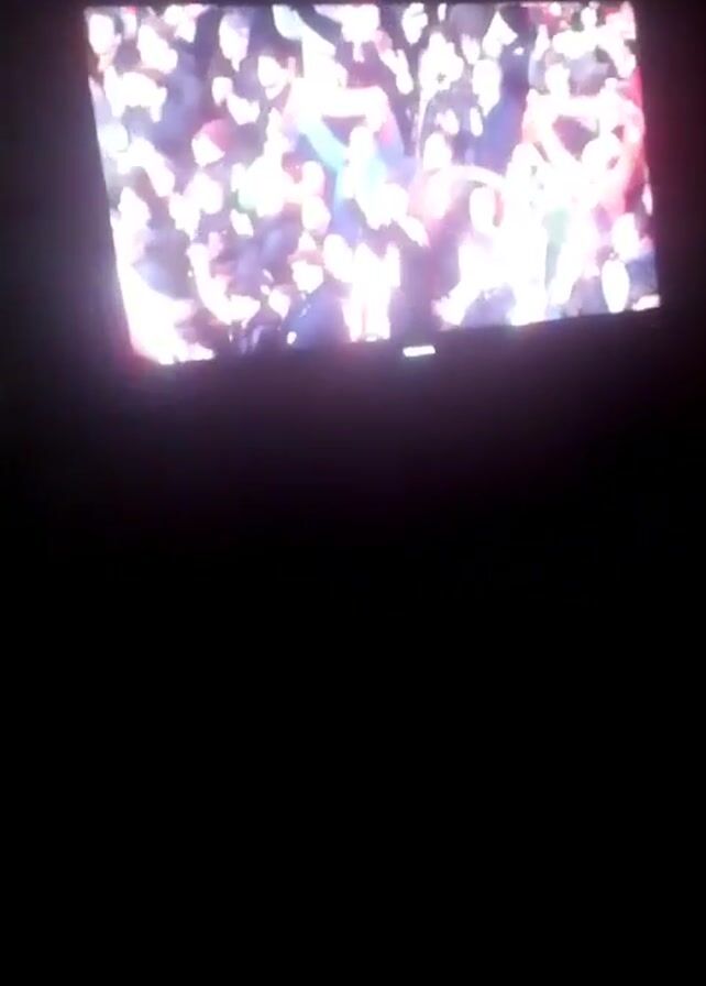 television screen displaying what appears to be footage of a crowd and then a man in a coat. The crowd seems to be cheering, and the lighting is bright, which may indicate a stadium or public event. The footage is presented on a screen in a darkened room, and the recording is unsteady.