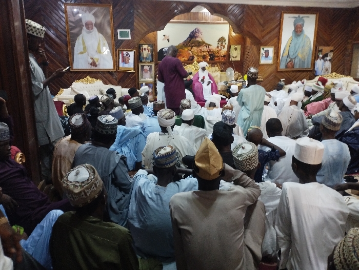The image depicts a scene inside a building in Kaltungo, Nigeria, with a large group of men gathered. The men are primarily wearing traditional clothing and many are wearing white caps. The men are sitting on the floor, with some standing in the background. The room appears to have wooden paneling on the walls, with framed artwork hanging on them. Some of the artwork depicts individuals in traditional clothing. There is a white couch in the background, with a man standing in the foreground leaning against it. The room appears to be well-lit and relatively spacious. The men are interacting with each other in a social gathering, with some conversing while others seem attentive to the speaker in the back of the crowd. The men are primarily African, but a few individuals in the background are of different ethnicities. The overall atmosphere of the image is one of a social gathering, with a relaxed and informal setting.