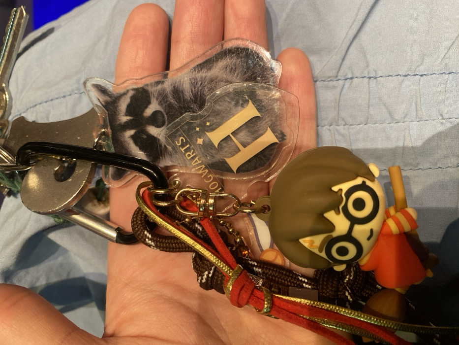 This scene is situated in the city of Paris, France. A human hand with a fair skin tone is depicted, holding a collection of keys and keychains. The primary attachment mechanism is a metallic carabiner-style keyring, to which several silver-colored keys are affixed. Connected to this keyring is a multi-component keychain assembly. This assembly includes a molded plastic charm in a chibi style, representing the character Harry Potter on a broomstick, wearing glasses, a red robe with yellow stripes, and a lightning bolt scar on his forehead. Adjacent to this is a clear acrylic or plastic keychain featuring the printed image of a raccoon. Overlaid on the raccoon image is a stylized gold 'H' emblem within a shield, with the word 'HOGWARTS' curved above it. Multiple braided cords and straps in brown, red, and gold hues are also part of the assembly, connected by small golden metal clasps and rings. The background consists of light blue fabric with visible stitching or folds, indicative of clothing or upholstery.