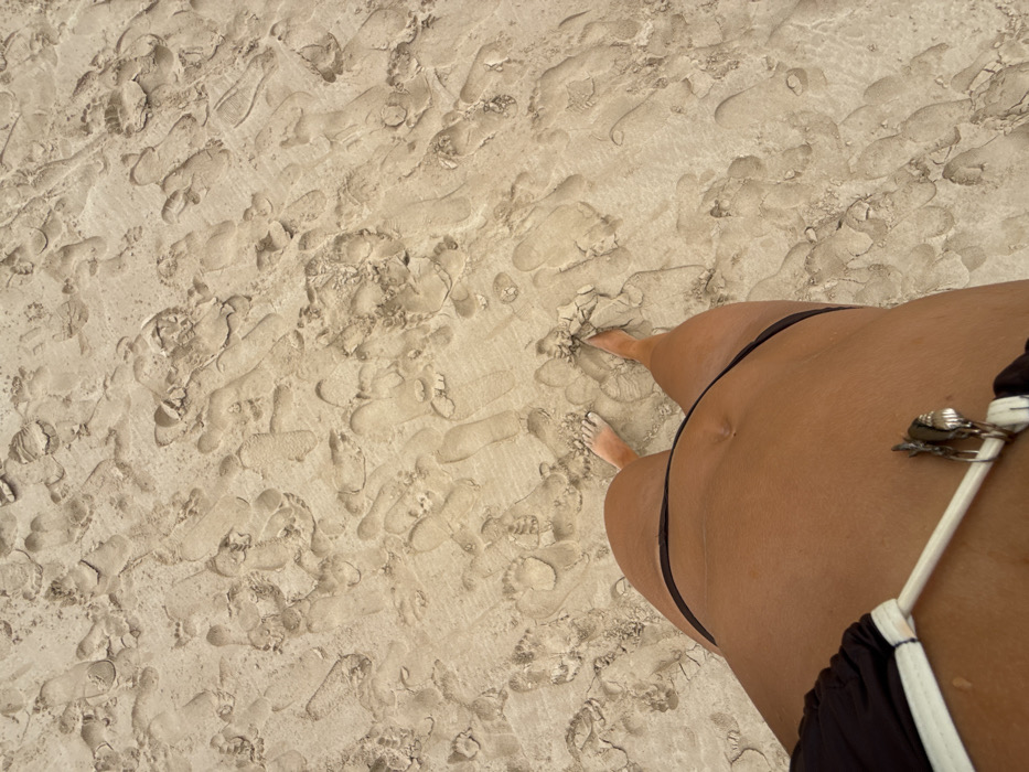 The image displays a high-angle view looking down at the lower torso and legs of an individual standing on a sandy surface in Kathaluwa, Sri Lanka. The individual's skin appears tanned. Dark-colored bikini bottoms are visible, along with a small portion of a dark bikini top featuring white trim and a small metallic accessory attached to the strap on the left. The individual's bare feet are visible, partially covered with light-colored sand. The sand-covered ground is extensively disturbed with numerous footprints of varying sizes and patterns, indicating recent activity. No other individuals or significant objects are visible in the scene.