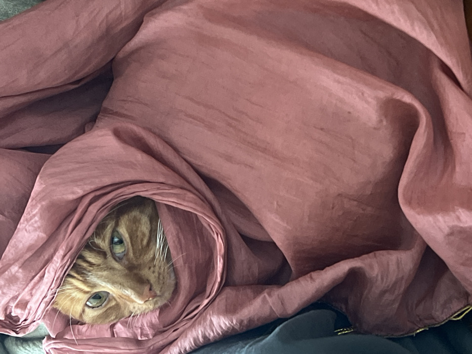 - "The image presents a close-up, vertical composition of an orange tabby domestic cat largely enveloped in a wrinkled, dull pink or mauve fabric" by FM-54iRr1, licensed under CC BY 4.0
