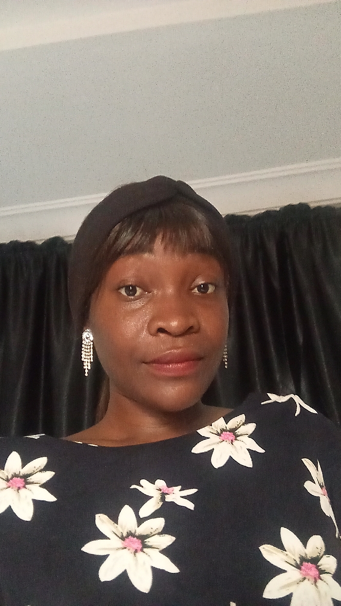 A portrait photograph taken indoors in Lugbe, Nigeria, depicts a single adult female of African descent