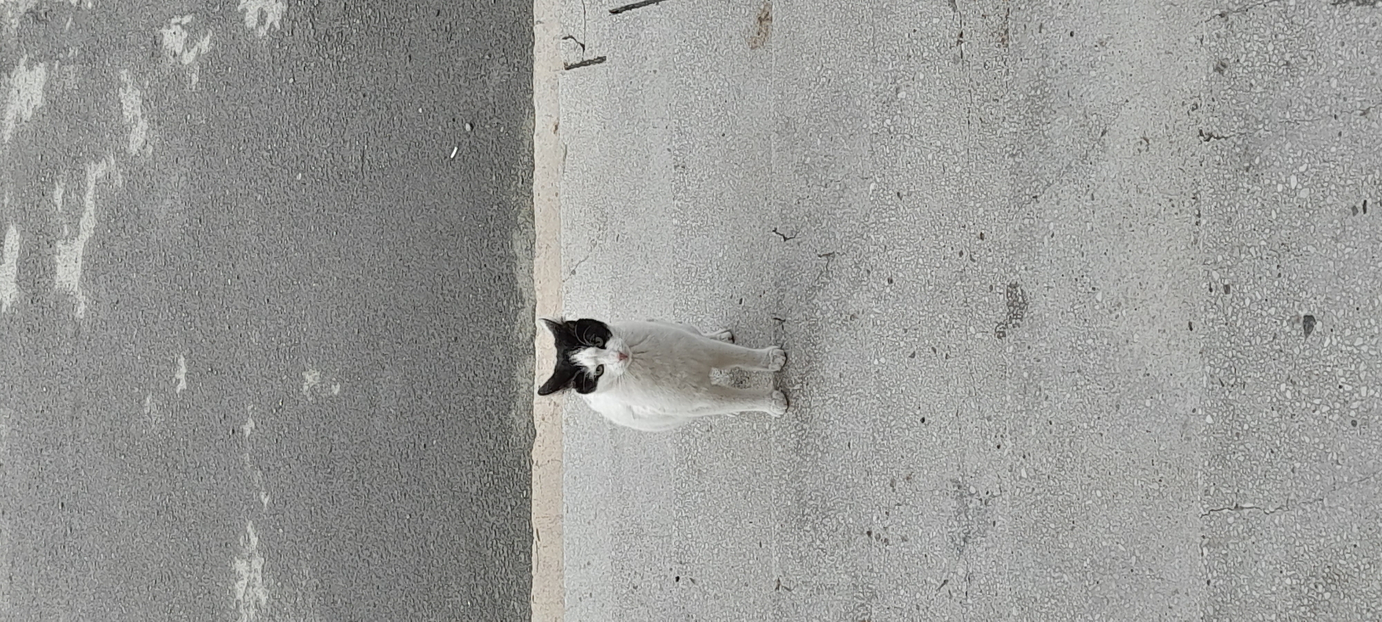 - "A domestic cat, predominantly white with distinct black markings covering its ears and extending around both eyes, stands centered on a light grey aggregate concrete surface" by FM-c8XTP2, licensed under CC BY 4.0