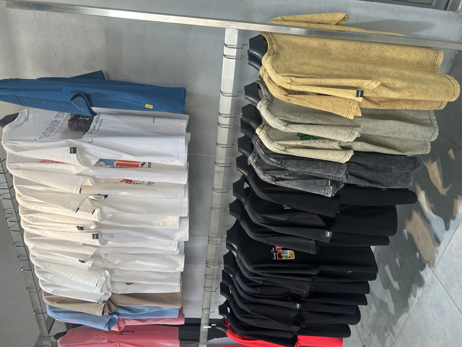 clothing store in Vung Tau, Vietnam, at the coordinates 10.349 latitude and 107.076 longitude. There are two racks of T-shirts. On the top rack are 13 white and blue T-shirts hanging on silver hangers with a variety of graphic designs, including images of a building, a surfer, and a cityscape. The rack is attached to a white wall. The bottom rack holds 14 T-shirts on silver hangers, all in shades of black, dark blue, and brown. The designs on these T-shirts are not visible. The floor is made of grey tile. The T-shirts are being sold in the clothing store.