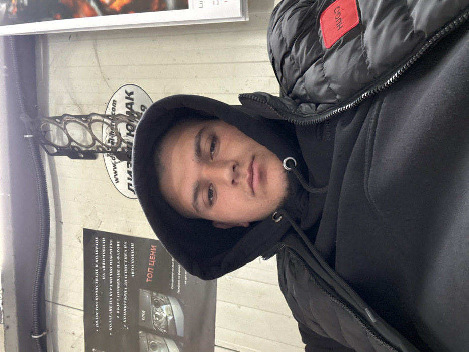 An individual is depicted from the chest up in the interior of an automotive service center or workshop located in Devnya, Bulgaria. The subject is a young adult male with short, dark hair and light facial stubble, wearing a black hooded sweatshirt with the hood pulled over his head, and a black puffer vest over the sweatshirt. A red rectangular patch with "HUGO" in white text is affixed to the left chest area of the puffer vest. He maintains a neutral expression and looks directly at the camera. The background consists of a light-colored wall, possibly concrete or painted plaster, exhibiting some wear. A black corrugated electrical conduit pipe runs horizontally across the upper portion of the wall. Affixed to the wall are several items: 1. A vertical poster on the left advertises car services in Bulgarian, including "FULL CLEANING AND POLISHING OF CARS," "APPLICATION OF CERAMIC COATING," "HEADLIGHT RESTORATION," and "COMPUTER DIAGNOSTICS OF CARS," along with "TOP PRICES" and images of vehicle headlights. 2. A metallic engine head gasket is suspended on the wall as a decorative element. 3. Below the gasket, a white oval sticker or sign displays the text "ДИЗЕЛ ЮНАК" (Diesel Yunak) and a partially visible web address "www.di**l-hern.com". 4. A vertical white poster with additional text and imagery is partially visible on the far right. The environment suggests an industrial or utilitarian setting consistent with vehicle maintenance. The individual is stationary, posing for the photograph.