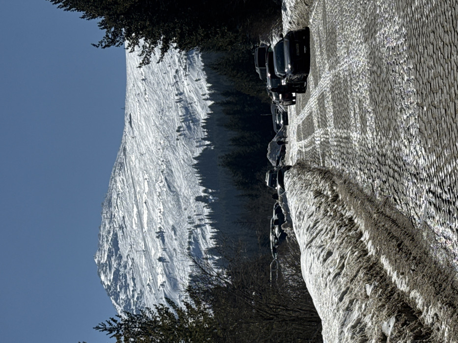The image captures a winter scene on Vitosha Mountain, located near Sofia, Bulgaria, under a clear blue sky. In the foreground, a stone-paved road is partially covered by melting snow, slush, and ice, exhibiting tire tracks and reflective surfaces. Substantial dirty snowbanks line both edges of the road. In the midground, multiple vehicles, predominantly dark sedans and SUVs, are parked along the right side of the road. Several individuals are visible; one person stands near a dark sedan on the right, while two smaller figures are seen walking away from the viewer further down the road. A dense coniferous forest occupies the area between the road and the upper mountain slopes. The background features a large, snow-covered mountain peak, exhibiting numerous ski slopes and visible ski lift pylons. The overall environment suggests a sunny day with active snowmelt.